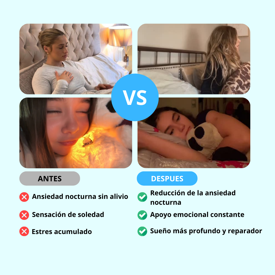 Con un tamaño ideal para acurrucarte, su respiración rítmica y textura suave crean una sensación de presencia que calma. Perfecto para parejas que duermen lejos, pero quieren sentir que siguen juntos, descansando mejor y despertando con más energía y tranquilidad.